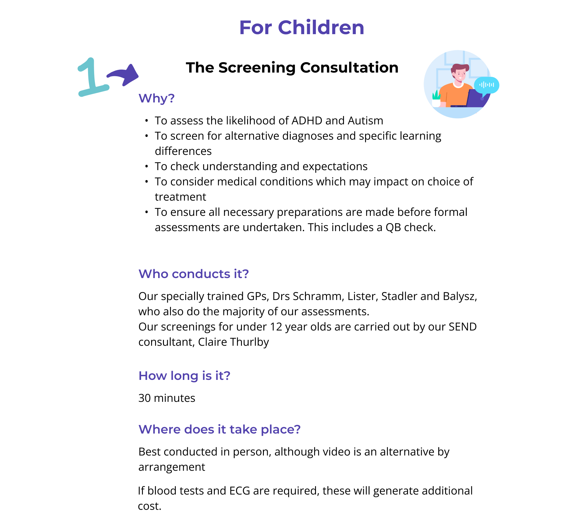 We undertake ADHD assessments in a two stage process: a Screening Consultation and then an Assessment Consultation